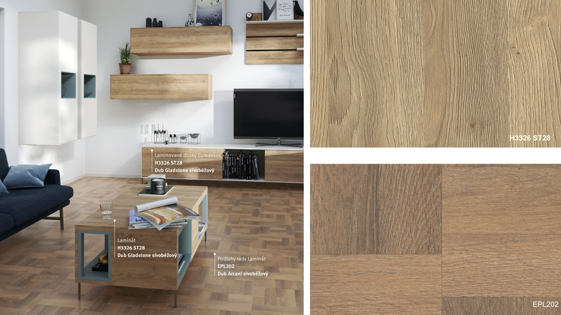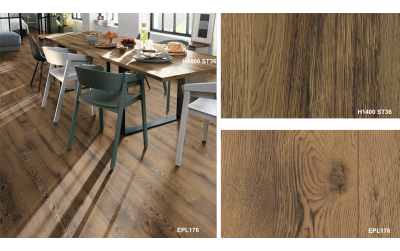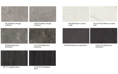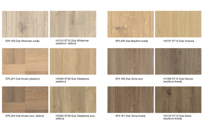 Prezrite si v našej galérii dekory podláh Colour Match, ktoré sú vzájomne farebne zladené s dekoratívnymi materiálmi EGGER. Všetky dekoratívne materiály sú označené číslom dekoru ( napr. H3133, F205 a pod.). Drobné odchýlky vo vzhľade dekoru podláh a nábytku sú možné vďaka rôzným povrchovým štruktúram.