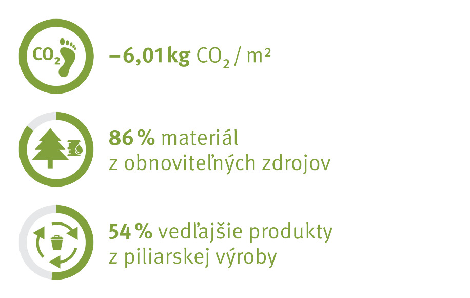 Podlahy EGGER Laminát majú negatívnu uhlíkovú stopu: - 6,01 kg CO2/ m2, pretože v produkte je viazaného viac CO2, ako sa uvoľní počas prepravy a spracovania. Uhlík viazaný v dreve stromov zostáva uložený po dlhú dobu, čo predstavuje cenný príspevok proti klimatickým zmenám a tiež dôležitý faktor pre hodnotenie životného cyklu (LCA) budov.